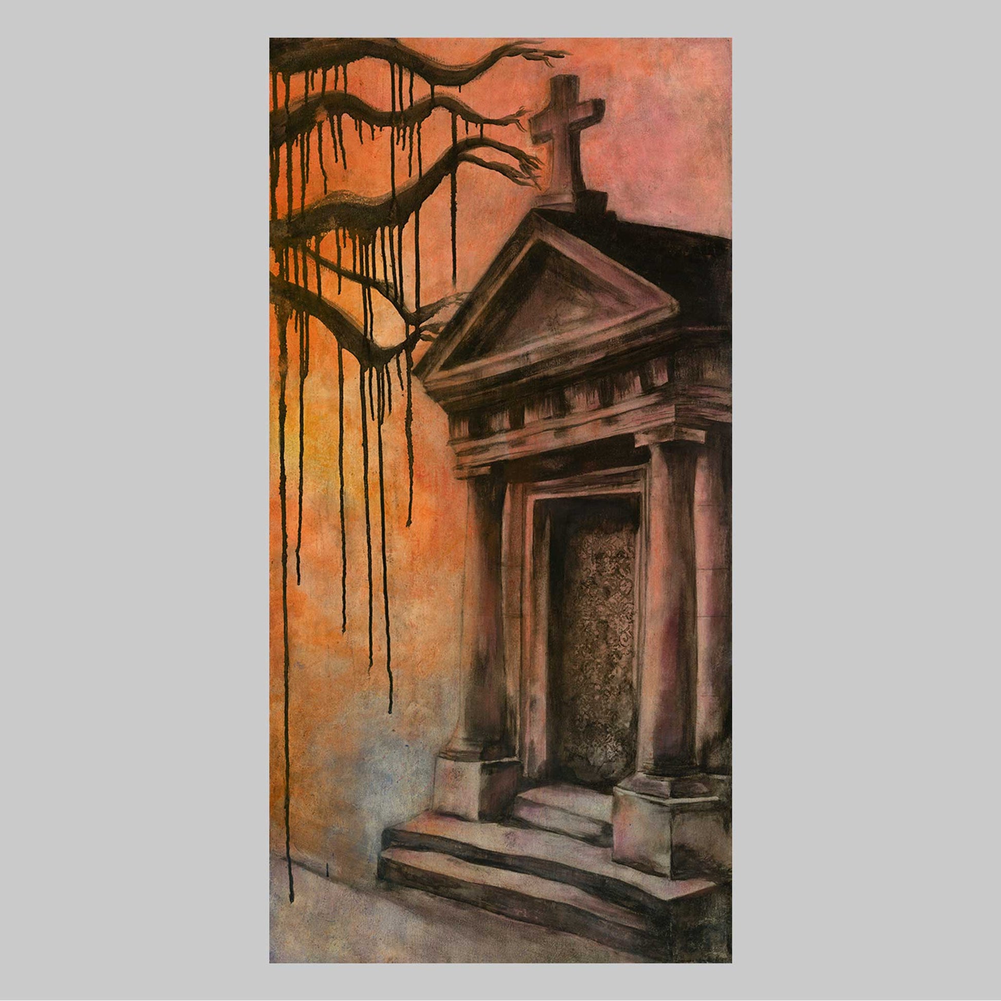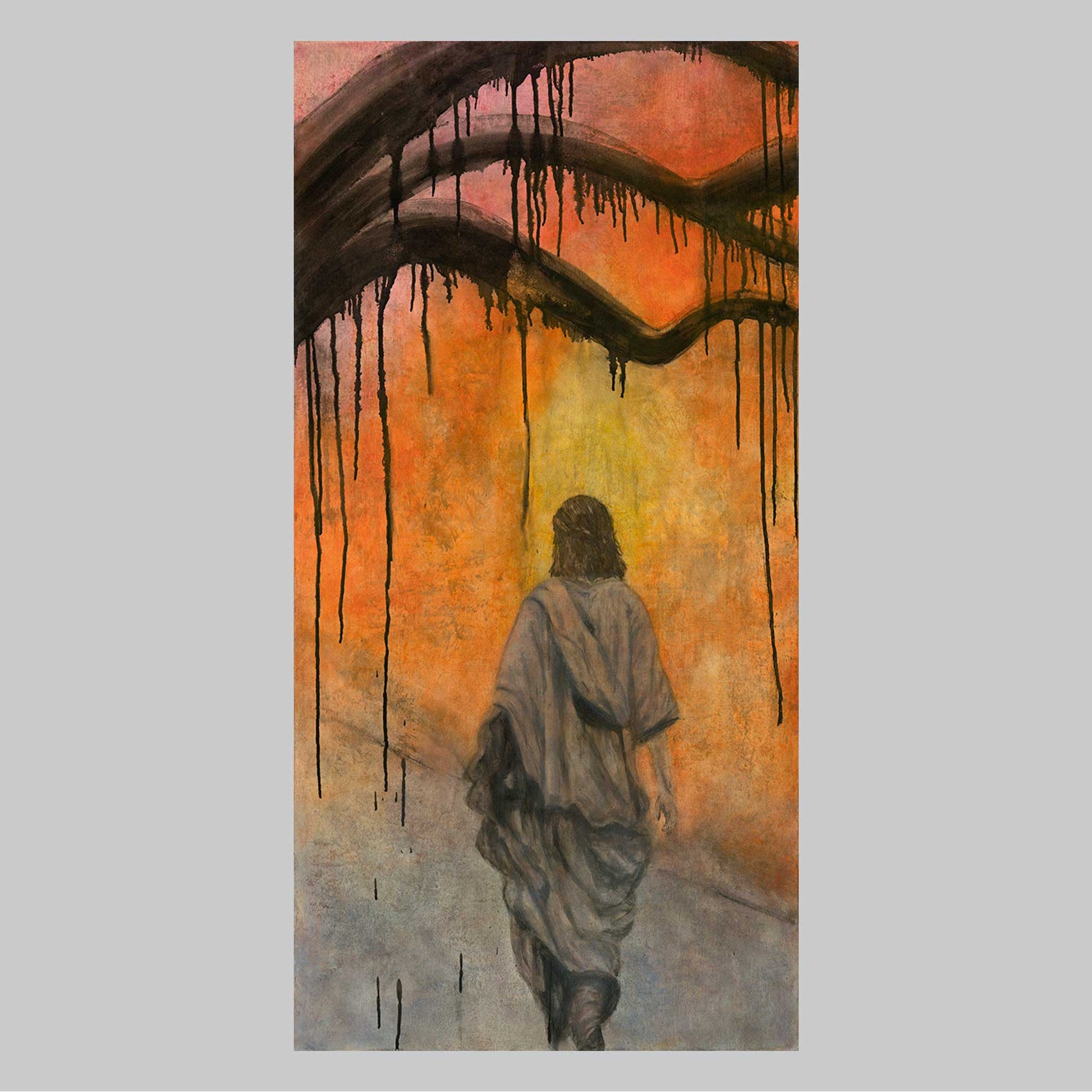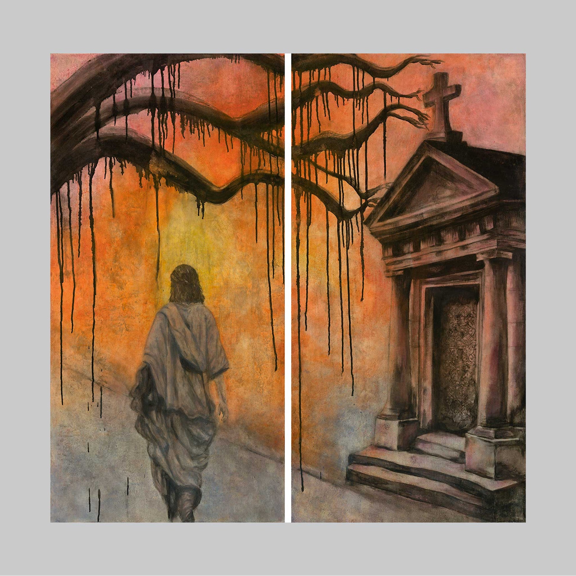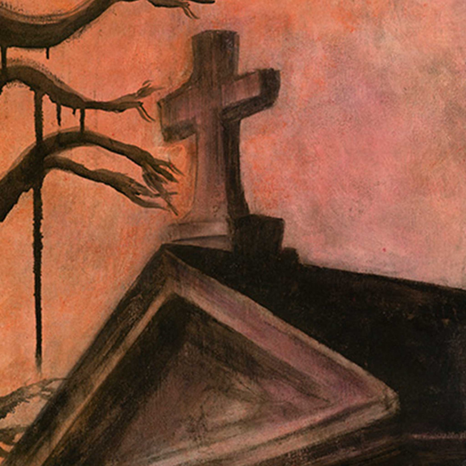 Jesus walks through the quiet cemetery beneath dripping shadowed branches, His presence both gentle and resolute. The tomb glows in the warm haze of sunset, symbolizing the tension between sorrow and hope.