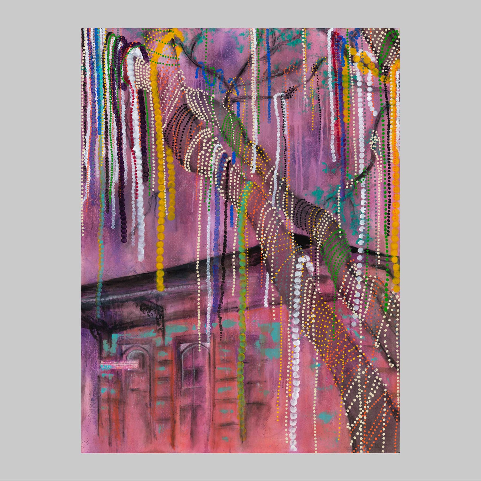 Where the Beads Land is a colorful depiction of the quintessential New Orleans celebration: Mardi Gras. This painting transports viewers directly into the heart of the festive season, capturing the dynamic energy and playfulness that define the Mardi Gras season.What truly sets this piece apart is the unique texture on the canvas itself, designed to mimic the look & feel of actual beads. This innovative tactile element invites viewers to not just see, but to feel the excitement of the moment beads come raining down from the sky. Welcome this vibrant piece into your home and laissez les bons temps rouler!